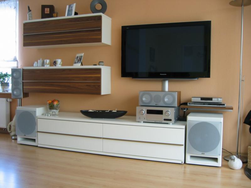 Farbe ist RAL 9001 - Cremeweiß, eben genau so wie die restlichen Möbel. Der Lack wurde mit einer Wagner gesprüht. Die Gitter haben wir günstig bei Nubert erstanden. Die passen 1a auf die Front. Zur Befestigung haben wir Löcher in die Front gebohrt, in die wir kurze Gummischlaustücke gedrückt haben. Diese Schlauchstücke dienen als "Buchse" für die Gitterhalterungen.