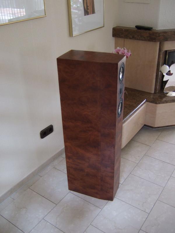 Das Gehäuse ist mit Bubinga Pommerle/Maser Furnier furniert und in drei Durchgängen mit Osmo Hartwachs-Öl seidenmatt überzogen.