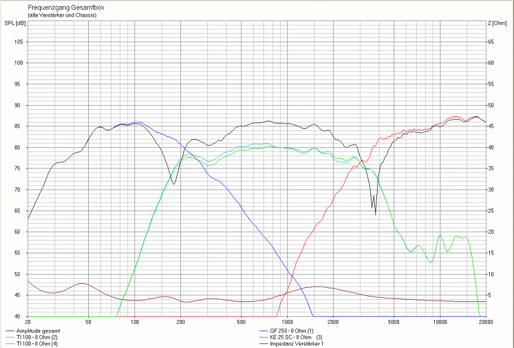 Der Vorschlag unter „Modifikationen“ basiert noch auf der alten VOX252-Weiche und geht von einem Bassreflexvolumen von 68l aus. Ferner siumliert er sich "nicht so schön".