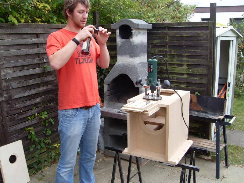 Der Subwoofer ist aus 19mm MDF, die Frontplatte ist 18mm Birke Multiplex. Der Korpus ist mit schwarzer Folie bezogen.