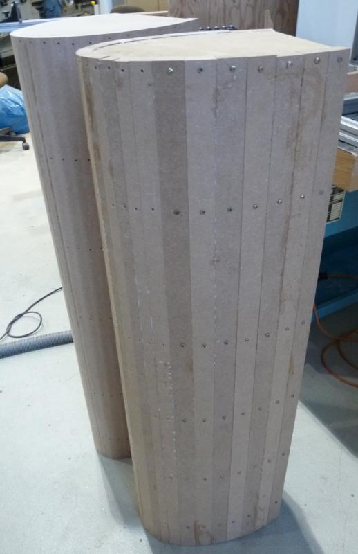 So weiter im Text. Inzwischen sind beide Korpi fertig geleimt. Ich habe versucht, die Gehrungen zwischen den Leisten an die Krümmung anzupassen, leider ist das nicht überall gelungen.