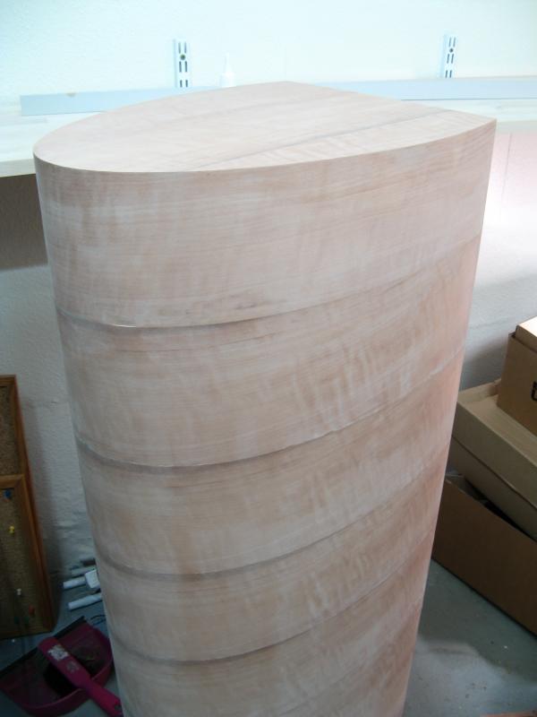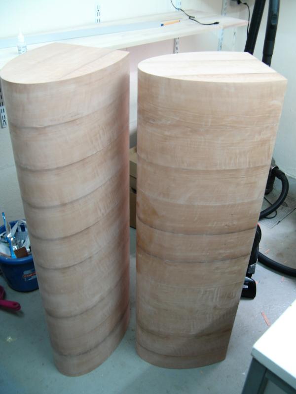 habe endlich wieder Zeit, an den Boxen weiterzubauen. Habe das Sperrfurnier auf beiden Gehäusen fertig, waren die "Elsbeere" Reste von meiner Experience. Ich habe es mit der Faserrichtung 90° zur Richtung der Trennfugen der MDF Streifen geklebt.