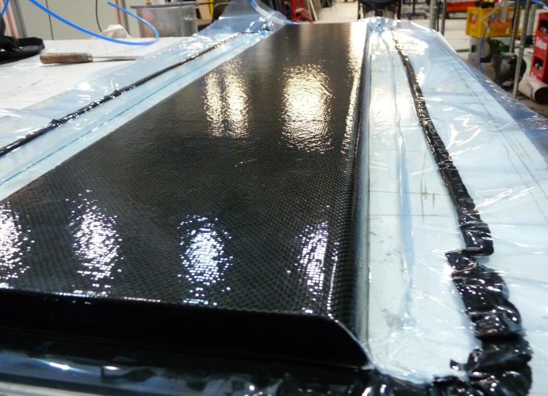 Wenn man eine glatte Oberfläche bei CFK haben möchte, muß die sichtbare Seite mit einer letzten Schicht 47gr oder gar 25gr Glasgewebe belegt werden. Die wird durch das Harz durchsichtig, trägt aber sehr zur Oberflächenqualität bei.