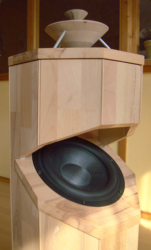 Aber nun zum Gehäuse, das noch nicht einmal auf dem Papier existierte. Die Fontana war mein Grundriss. Der Tieftöner sollte in einem 30 bis 45 Grad Winkel verbaut werden. Tiefe Töne breiten sich im Gegensatz zu Höhen eh allseitig aus. Ich zeichnete, rechnete und dies war das Ergebnis (siehe Foto). Eine Box aus reiner Buche.