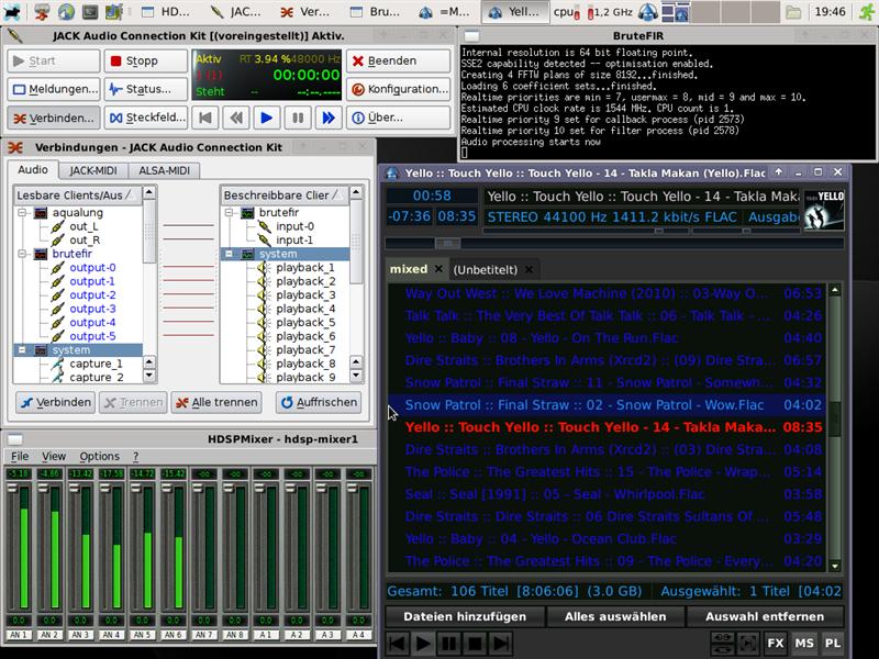 In dem Fenster "Verbindungen" sieht man von wo nach wo das Signal seinen Weg nimmt. AUsgangspunkt ist der Player(Aqualung) dann gehts zum Convolver(Brutefir) und von da aus mit 6 Kanälen in die Outputs der Soundkarte(Playback).