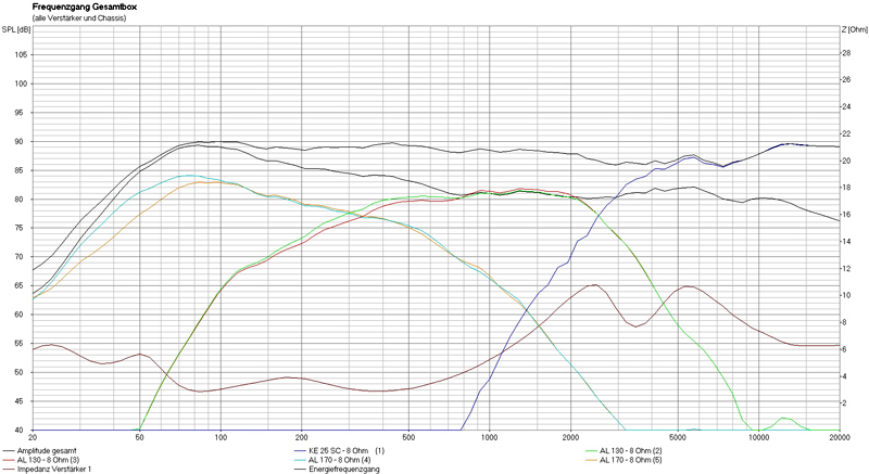 Den Weichenänderungsvorschlag von jama habe ich teilweise aufgegriffen: Im MT-Zweig habe ich eine Spule von 0,15 mH in Reihe vor die AL130 gesetzt (18dB-Abfall zur KE 25 hin). Der Klang ist in den Mitten in der Tat etwas durchhörbarer geworden, ohne (!) an Aggressivität zugenommen zu haben. Gefällt mir besser. Der Energiefrequenzverlauf ist dadurch auch etwas gleichmäßiger geworden.