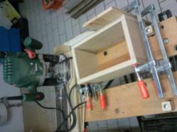 Zunächst wurden alle Aussparungen herausgefräst bzw. gebohrt (dank sei dem 35mm Bohrer für das Bassreflexrohr). Anschließend hab ich mit der Kreissäge auf 45° die Fasen geschnitten. Dann nur noch leimen und viel viel schleifen...