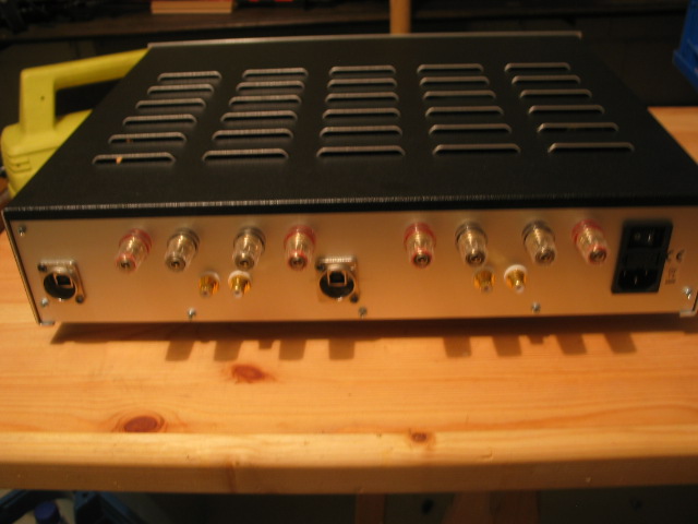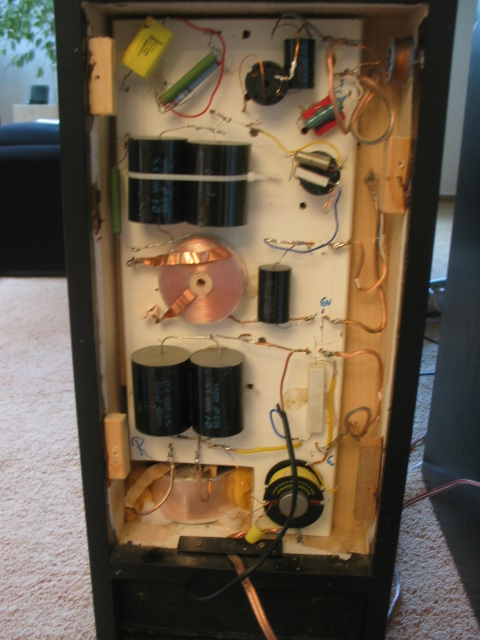 Im Anhang die Rückseite der Endstufe mit den USB-Buchsen, Innenansicht, Weiche vorher (nicht zu sehen die Kondensatoren für die Imp-Korrektur im verschlossenen BR-Kanal) und die Weiche nachher.