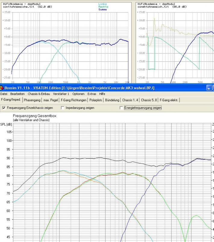 Da ich nicht über ein Messprogramm verfüge und mich nicht mit all den Problemen der Soft/Hardware herumschlagen will, werde ich die Messungen am Hörplatz nur bis 300 Hz in der bei üblichen Methode machen und darüber auf mein Gehör, Erfahrung und Boxsim vertrauen. Ich war ja mit der passiven Concorde zufrieden bis auf einige Raummoden, die auch durch umfangreiche RA-Maßnahmen nicht völlig zu beseitigen waren. Und man soll sich ja auch mal was Neues gönnen.