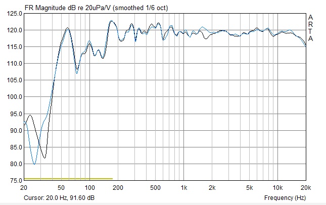 Die grössere Hürde bei der Simulation war aber wieder der W100S, der Boxsim-Datensatz stimmt einfach nicht. Daher habe ich dann eigene Nahfeldmessungen eingelesen. Mangels reflexionsarmen Raum sind die Kurven im Bassbereich natürlich nicht so aussagekräftig. Den resultierenden Frequenzgang bekäme man evtl. noch ein klein wenig glatter hin, aber ich habe Frequenzweichenbauteile verwendet die meine Bastelkiste hergab. Die Spule vor dem TT beeinflusst die Filterflanke nicht, sondern blendet nur die höherfrequenten Anteile etwas aus.