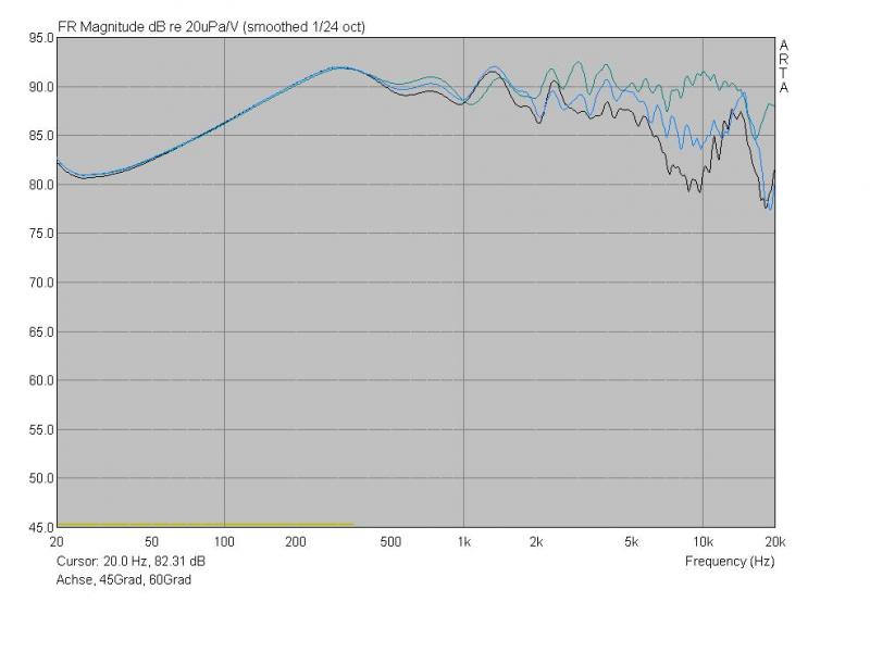 ... Anbei auch die Winkelfrequenzgänge unter 45 und 60Grad, keine grosartigen Ausreiser zu erkennen, bis auf die recht dicke Aufweitung bei 15kHz, je mehr Winkel, desto mehr Pegel in diesem Bereich, wie bei der KE auch, aber wen störts. ...