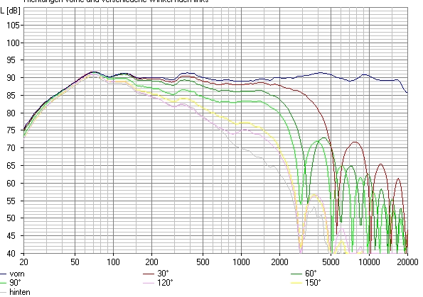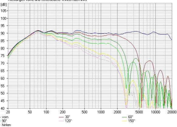 Leider sieht man nicht die Unregelmäßigkeiten unter Winkel. Auch nicht im Winkeldiagramm, es ist also nicht möglich, die unregelmäßige Abstrahlung zu simulieren! Wenn man das vernachlässigen will, kann man die KE nehmen. Bei mir klang das ja auch mit der 1. Weiche, die als Basis bei Visaton diente, gut.