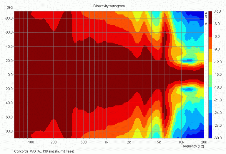 Man könnte auch sagen, sie strahlt bei 12000 zu schmal. Interessant, dass auf Achse genau hier (Wirkung des Diffusors?) eine Pegelanhebung um 4 dB ist, die mit einem Saugkreis beseitigt wird. Vieleicht sollte man das gar nicht machen, um die Seke im Diffusschall zu mildern? Ich werde das mal testen, wenn ich die Boxen optimiere mit DSP.