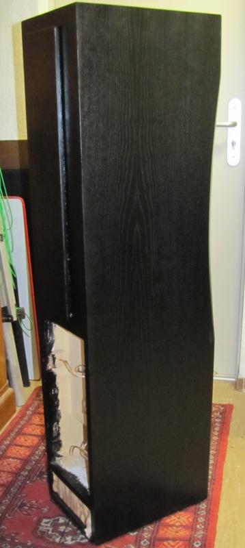 Die Gehäuse wurden 3 x mit Autolack gesprüht, was problemlos war. Ich habe in Faserrichtung eine Lage neben die andere gelegt, bis der Lack begann zu verlaufen, also kurz vor "Nasenbildung". Anschließend wird einmal mit Klarlack (Jaeger Exquisit) gerollt. Der Glanzgrad ist auf meine Möbel abgestimmt. 4 Teile seidenglänzend, 1 Teil tuffmatt. Ohne diese Deckschicht sind die Poren zu stark ausgebildet und schmutzanfällig, außerdem wird die Lackierung etwas strapazierfähiger.
