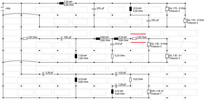 Rainer, ich habe mal statt der Al 200 die 170 eingesetzt, die du verwendest. Mit der Originalweiche meiner C-WG verlierst du im Tiefton 1,5 dB. Also musst du die Vorwiderstände im MT+HT vergrößern. Teste mal 3 Ohm im MT und 2 im HT plus die Änderung des Kondensators.