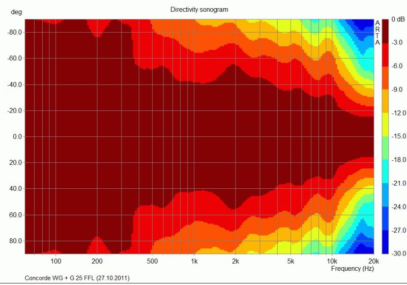 , die Abstrahlung schön gleichmäßig.Auch das Sonogramm wurde neu aufgenommen, das sieht bis auf die Aufweitung bei 2000 Hz (schmale Fasen) prima aus.