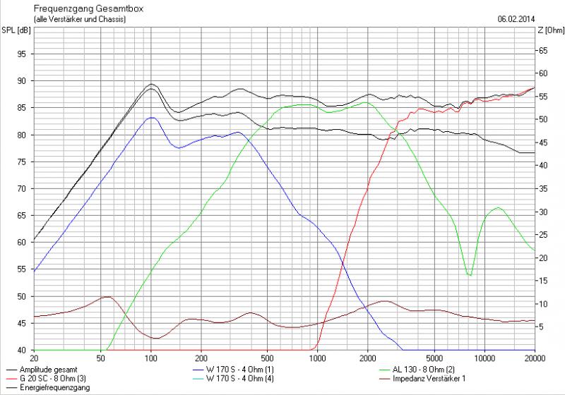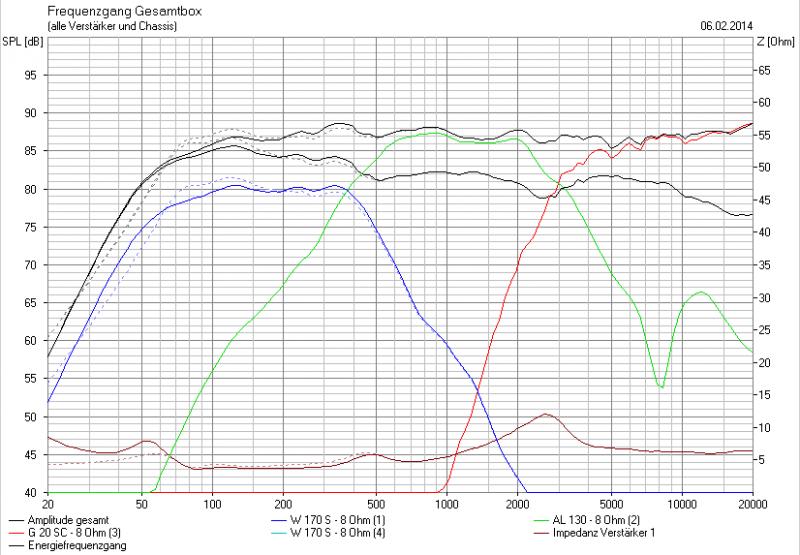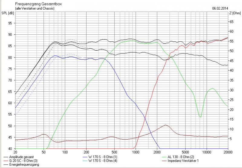Habe da entsprechend paar Sachen umgestelt..wg. dem höheren Qtc musste ich das Volumen etwas erhöhen (Qtc lag bei über 1 bei 8 Litern ). Damit der Bassbereich flacher anfängt mussten auch zwei 470er Kondensatoren als Hochpass rein - anbei Grafiken ein mal mit und ein mal ohne HP + BPJ