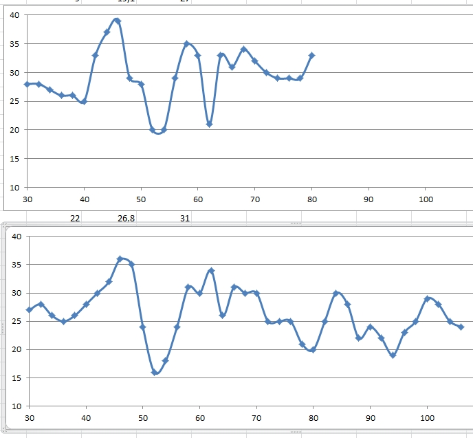 Inzwischen sind die Polstermöbel gestellt, also mal am Hörplatz gemessen mit der bevorzugten Einstellung des Subwoofers auf Stellung 2,5 von 10. Von 30-100 Hz, Sub und Frontboxen, Aufstellung wie auf dem Foto. Bei dem oberen Diagramm war der Sub hinter dem TV, direkt an der Wand.
