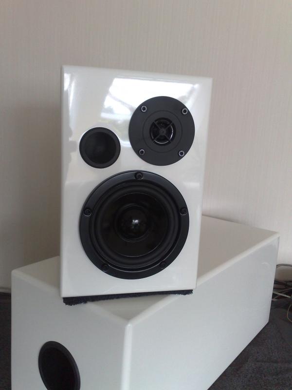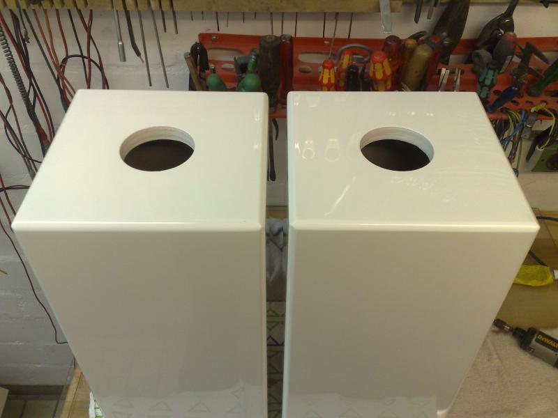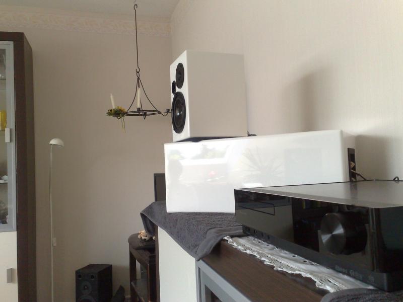 Diese hab ich für meine Freundin gebaut, in der Küche dürfen sie sie jetzt für einen guten Ton sorgen. Auf den Bildern ist zu sehen wie der Lack vor dem Polierschliff und dem Pollieren aussieht. Daher hab ich mal die Mickey Mäuse draufgelegt um die nicht vorhandene Reflexion zu zeigen . Zum Probehören hab ich sie dann doch erst einmal in das Whz gestellt. Versorgt werden die kleinen von einem Pioneer Z9.