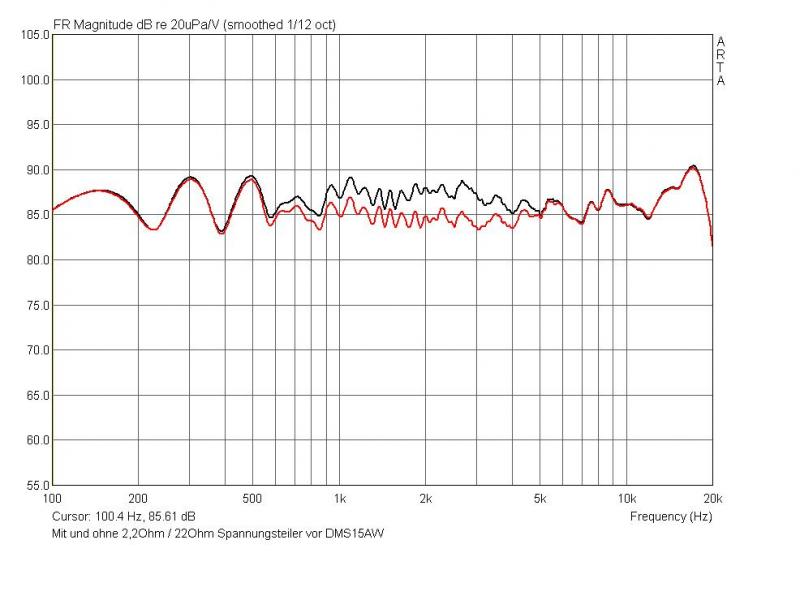 Nehme an das es wirklich Abstimmungssache ist um Klangunterschiede erklären zu können. Somit möchte ich meine schlechte Kritik die ich mal an der SC10N ausgelassen habe erst mal zurücknehmen, zumal seinerzeit keine Messmöglichkeit vorhanden war um sie richtig mit der DSM25 vergleichen zu können.In der Simu geht die Impedanz bei 2,8kHz auf ca. 2,5Ohm runter, in der Realität aber ists grad noch so "in der Norm", aber egal, der Verstärker hat keine Probleme. Die Simugenauigkeit ist ziemlich gut, bis aufs obere Ende der Mitteltonkalotte, eben da wo auch die Impedanz zu gering simuliert wird und die Ampiltude entsprechend dazu ansteigt. Der Frequenzgang der DTS10AW macht zwischen 6 und 10kHz einen Buckel, der wird von einem Sauger entschärft, sonst ist alles im Lot. Das zweite Bild zeigt den Mitteltöner ohne Spannungsteiler und mit, in meinem Fall wird diese Aufgabe ein LC95 auf der Rückseite übernehmen.