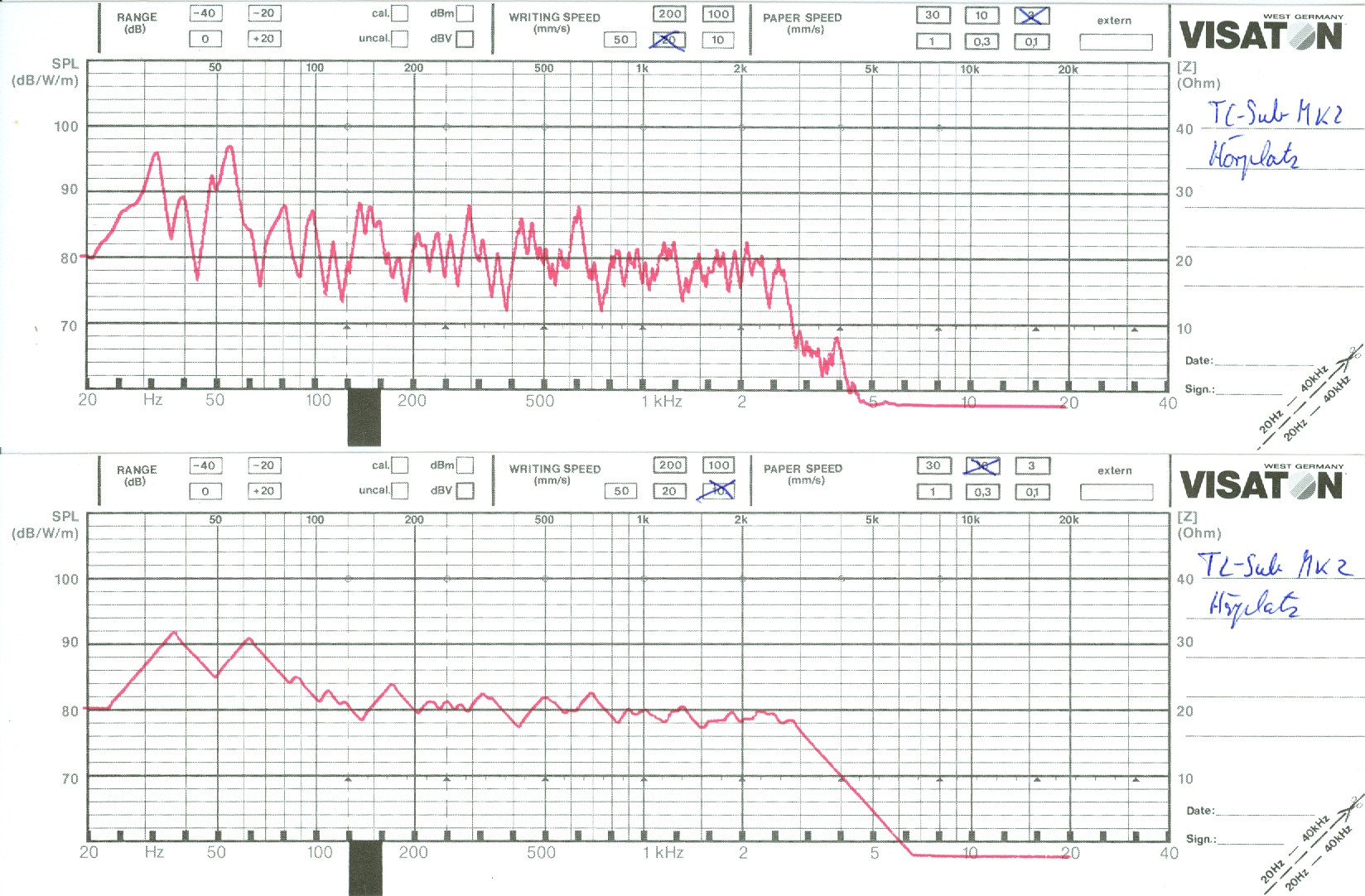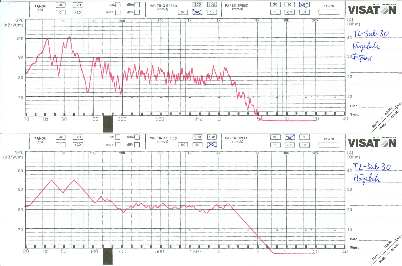 Während des Forumtreffens 2015 hatten wir die Chance, beide TL-Subwoofer (also unseren TL-Sub 30 und die eckige Version des TL-Sub 30 MK II) in unserem Hörraum zu vergleichen. Ich hatte zwar auch versucht, die Subwoofer im Freifeldraum zu messen, aber das machte bei Einsatzbereichen bis unter 20 Hz keinen Sinn.
