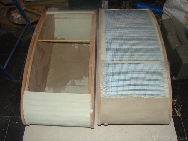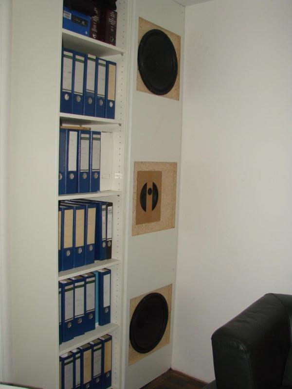 Das Gehäuse des linken Rearspecker besteht zur Hälfte aus 30cm Stahlbeton und zur anderen Hälfte aus 22mm MDF. Es ist nur ca. 8cm tief dafür aber 1,42m hoch und 32cm breit. Das ganze spielt CB. Das Gehäuse wurde mit Gewebe und Gipsspachtel so bearbeitet, dass es wie eine normale Raumecke aussieht. Farbe ist normale Wandfarbe, damit es sich nicht von den restlichen Wänden absetzt.