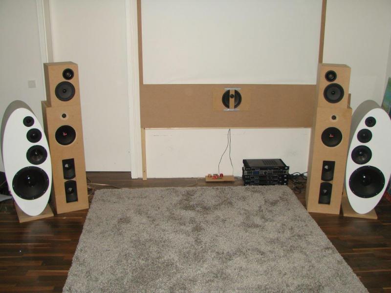 Einen Center habe ich natürlich auch, aber das ist noch vom Finish nicht so wie es mal werden soll. Zu den Fronts nur ganz kurz, da hier nix von Visaton spielt, das sind zwei Klone der HSB Rockets. Bis auf der MTK, spielen hier ganz andere Chassis. Das ganze kann ich aktiv und passiv betreiben: