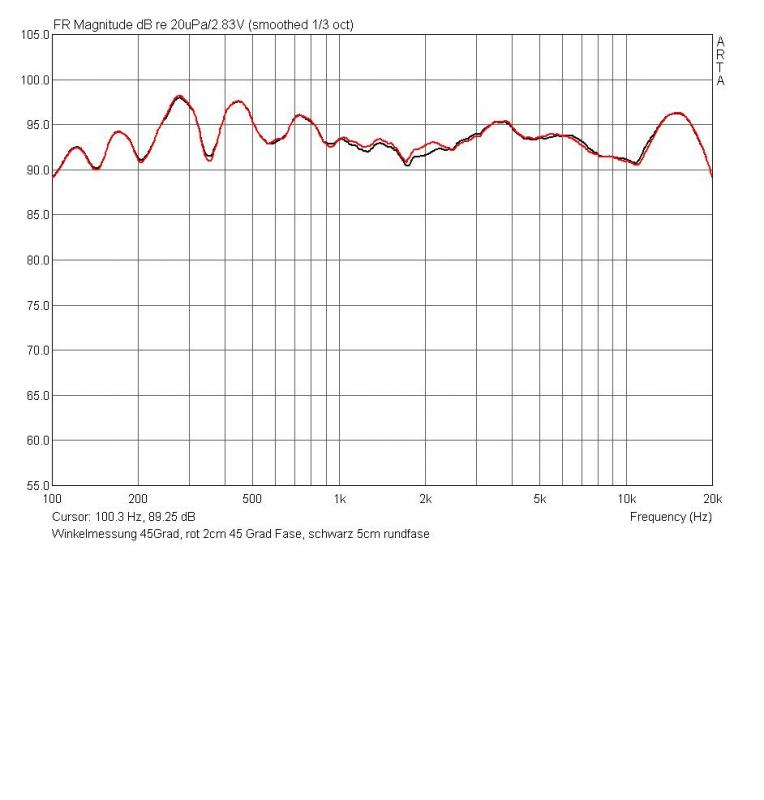 Ob der kleine Buckel bei 4kHz eine unzureichende Bündelung des WG´s ist oder eine Kantenreflextion am Gehäuse wird sich noch rausstellen bei Versuchen mit verschiedenen Fasen, im Versuchsgehäuse ist ja alles „kaputtbar“. Schön ist jedenfalls das die Amplitude unter Wickel nicht über den Achsfrequenzgang schiest, trotzdem geht da sicher noch mehr.