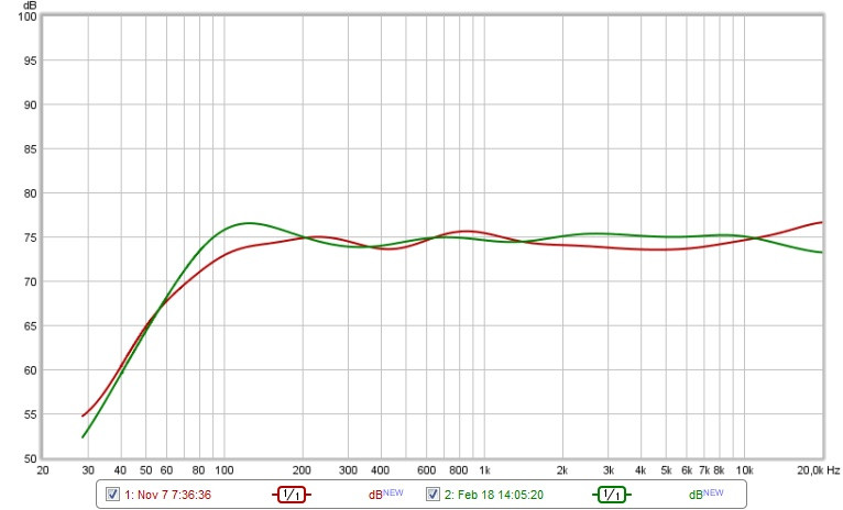 So, Buckel ist erledigt; 11 Liter und etwas mehr Dämmzeugs (Seitenwände 30mm Noppe, Rückwand 40mm Steinwolle, Rest locker mit Polywatte). Der Vergleich quick & dirty mit viel Glättung: