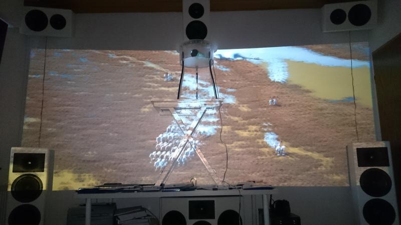 Es werden jetzt also 3 möglichst flache 3-Wege Belle-Abarten entwickelt, die sich so identisch wie nur möglich zu den unteren 3 verhalten. Diese werden dann exakt im selben Hörabstand an die Decke gespaxt und von einem zusätzlichen Receiver gefüttert. Damit sollte das Problem erstmal gebannt sein und der Ton schön mitten aus dem gigantisch großen Bild rauskommen - auch ohne akustisch transparente Leinwand