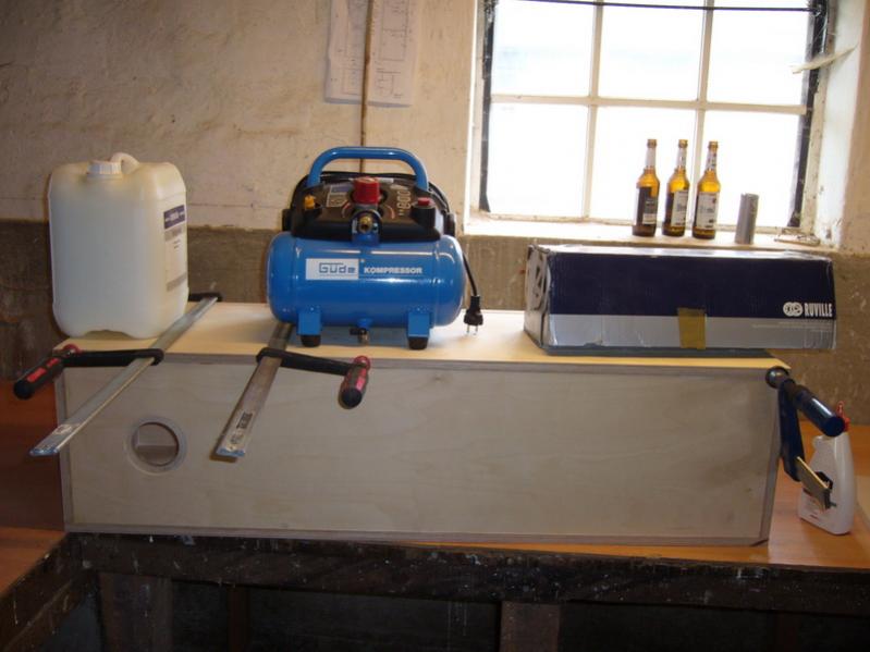 Im Grunde ist das Multiplex nach dem Fräsen nur einmal mit 120 und dann mit 240 geschliffen. Anschließend Lasur Teil 1, trocknen lassen und nochmal mit 240 schleifen, da sich die Fasern noch wieder aufstellen.