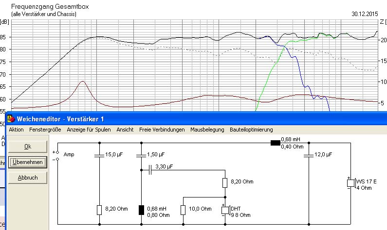 diese box wird sicher sehr gut, ein kleiner kritikpunkt, per simulation lässt sich eine solche box mit hochtonhörnchen nicht entwickeln, das hörnchen hat enorme phasensprünge rund um die trennfrequenz, ich merkte dies beim tl16h, ... ich musste bei der aria tl sehr steile weichen umsetzen, visaton hat damals maßgeblich die weiche verbessert. http://boxsim-db.de/aria-tl/