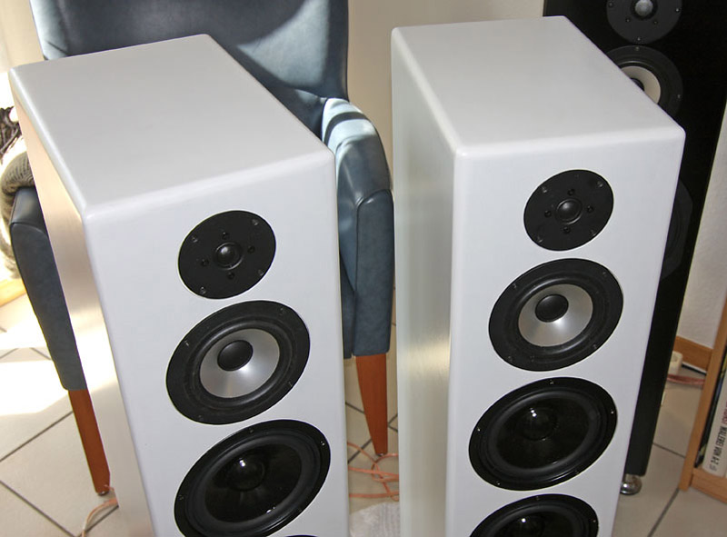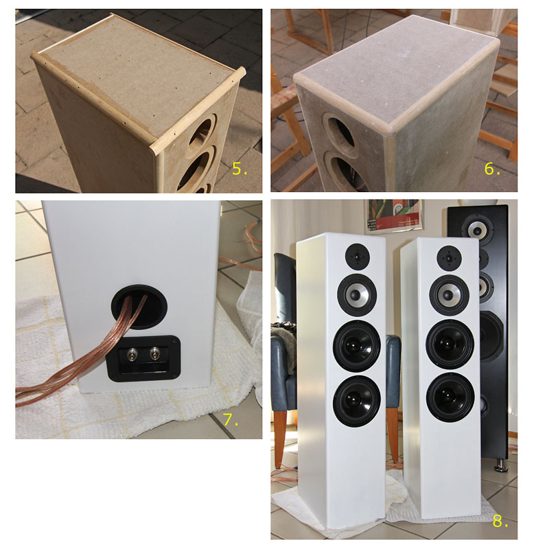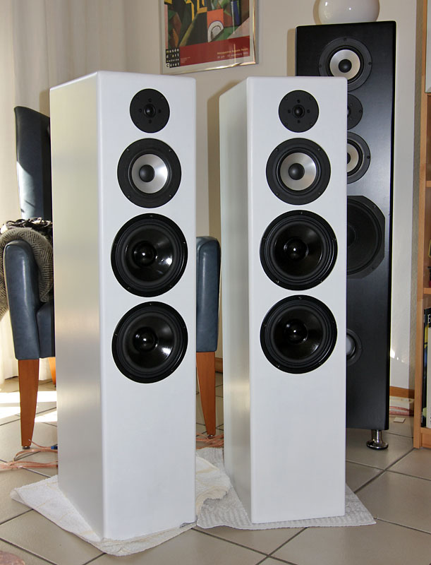 Zu Bild 7 + 8: Die fertige Box. Anstrich mit weißem Acryllack. Die Farbe hat meine Tochter bestimmt. Die LS-Strippen sind nach draußen geführt, um die in BoxSim entwickelte Weiche gehörmäßig noch abzustimmen. Die Boxen werden im Endzustand auf eine Multiplexplatte mit Spikes gestellt.