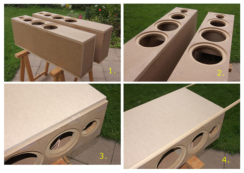 Zu Bild 3 + 4: Die Gehäusekanten wurden mit ¼-Stäbe (Radius 13 mm) versehen. Dafür wurden die Boxenseiten mit 12 mm MDF belegt. An beiden Kanten um 12 mm verkürzt, damit die ¼-Stäbe dort hineinpassen. Zur Fixierung wurde geleimt und genagelt.