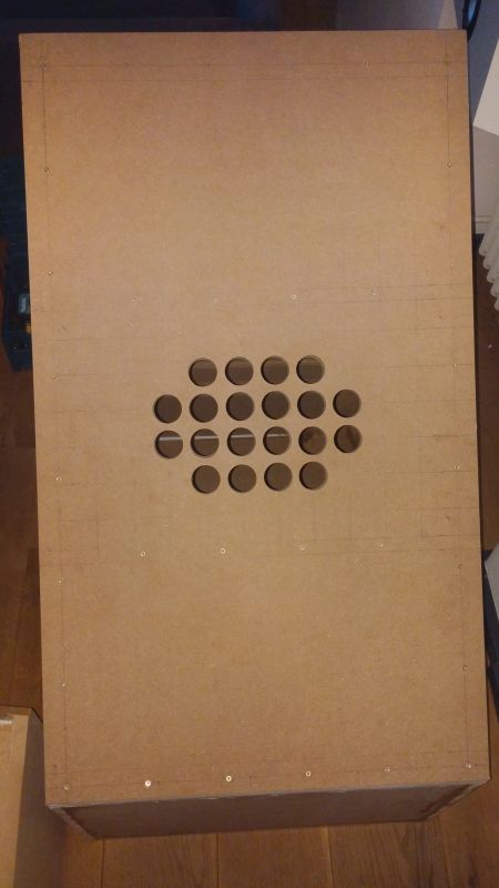 Aufgehört habe ich mit 20 Bohrungen a 40mm. Und das Beste ist, mit einem symmetrischen Bohrbild. Das entspricht eigendlich einer Abstimmfrequenz von ca. 39,5Hz. Bis zur zenten Bohrung stimmte Praxis und Theorie genau. Danach sind die Werte immer weiter auseinander gedriftet.