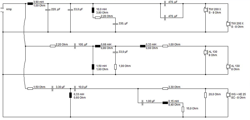 Der TT-Zweig wurde von mir auf die TIW200 angepasst. Die niedrige Impedanz von 2,5 Ohm müßte man sicher noch anpassen, wobei die Concorde WG 3,2 Ohm aufweist.