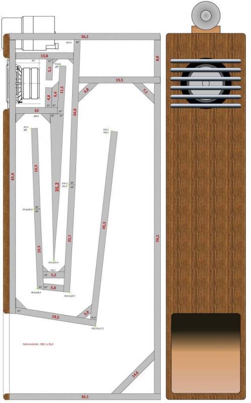 Das Exponentialhrn stellt mit dieser Faltung die m.E. maximale Ausnutzung des verfügbaren Gehäusevolumens dar. Die Hornlänge beträgt fast 3m.