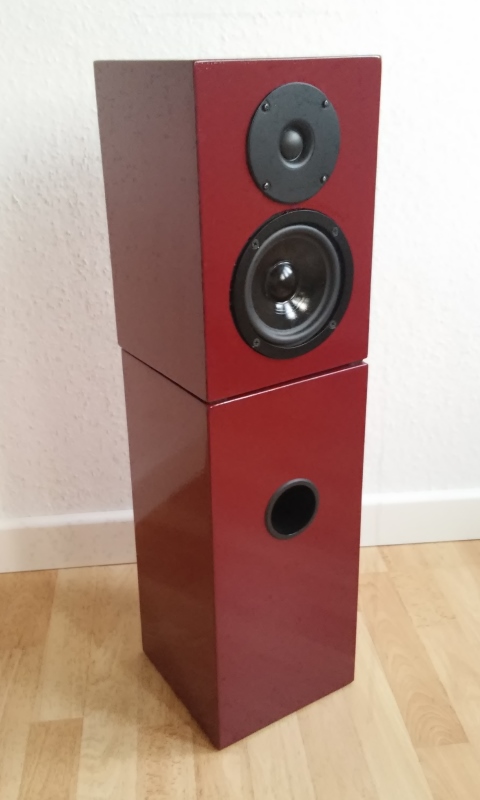 Zunächst der W 130 DC ohne und mit der TT-Frequenzweiche aus dem Set, eingebaut in die modifizierten Gehäuse meiner Frands, mit 20cm Schallwandbreite etwas schmaler als der Gehäusevorschlag von Visaton, 16 Liter Bassreflex, das BR19.24 auf 12cm gekürzt und damit auf 60Hz abgestimmt. (und das Chassis mit einem netten Zierring versehen).