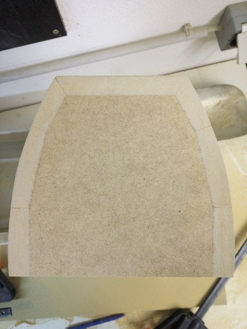 Um bei dem Gehäuse eine Rundung zu bekommen, überlegte ich mir dieses erst leicht eckig zu machen und danach rund zu schleifen. Ich zeichnete also erst eine 1:1 Skizze, in der ich Masse und Winkel einzeichnete. Mit der Skizze ging ich dann zum Tischler und ließ aus 16mm MDF die Bretter mit den entsprechenden Gehrungen zuschneiden.