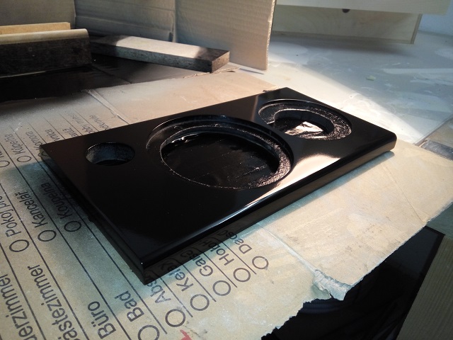 Die Front habe ich dann mit Spritzspachtel ein paar mal gespritzt, danach ein paar Schichten schwarzen Lack und dann Klarlack. Natürlich habe ich dazwischen immer brav geschliffen. Lackiert wurde mit 1K aus der Dose, wobei ich nicht noch einmal 1K Lack nehmen würde. Dieser lässt sich nicht vernünftig polieren. Er wird nicht hart genug.