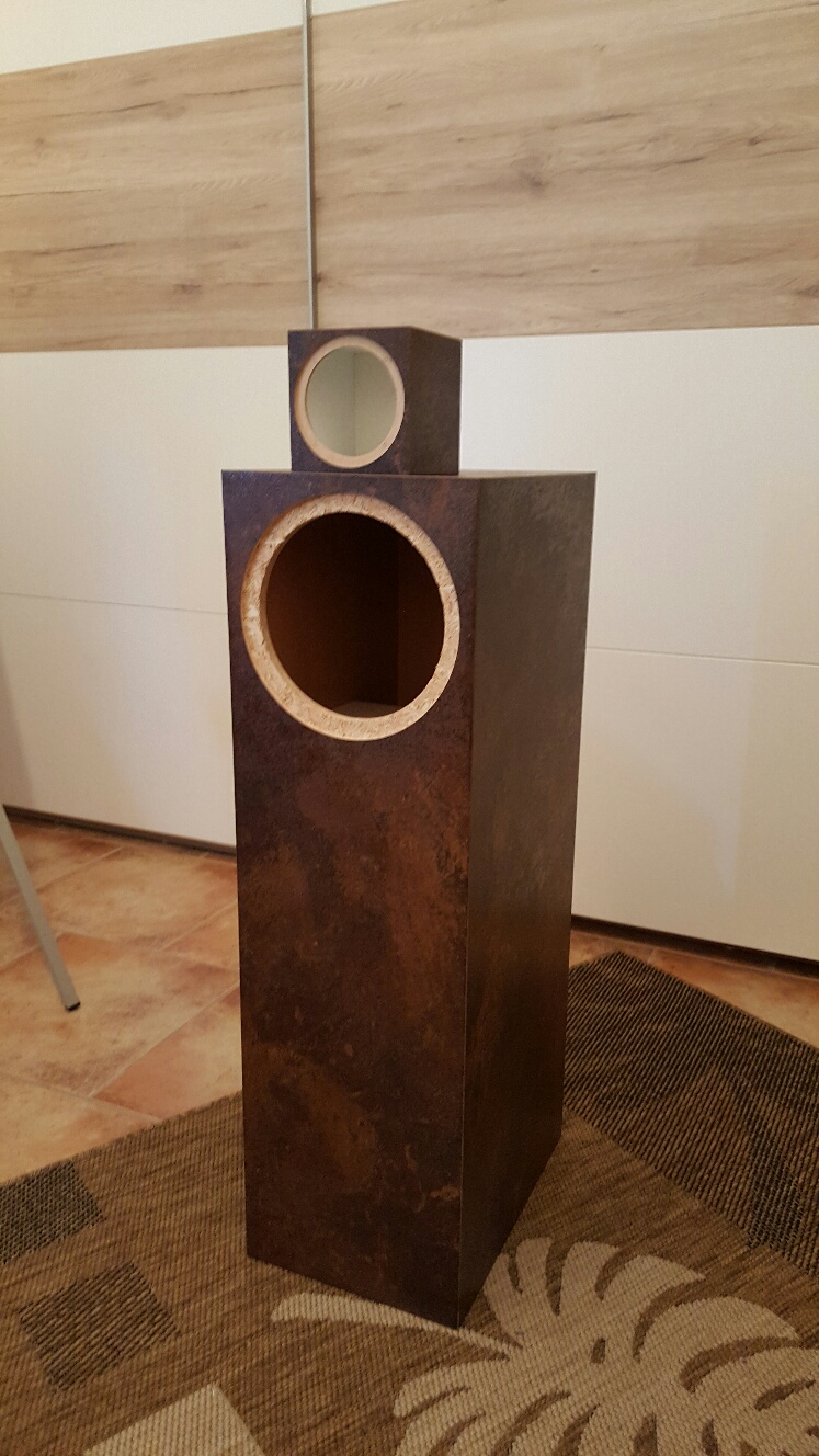 Die Box besteht aus zwei getrennten Gehäuse, einem 55l BR-abgestimmten Bassgehäuse für den TIW und einem kleinen Würfel mit 1l für den B80. Das Basscompartment ist mit 2 Kreuzen versteift und besitzt im unteren Bereich einen Zwischenboden, der auch ein kleines Abteil für die Weiche bietet. Es besteht aus 19mm beschichteter Spanplatte. Das Gehäuse ist 253mm breit, 360mm tief und 850mm hoch.