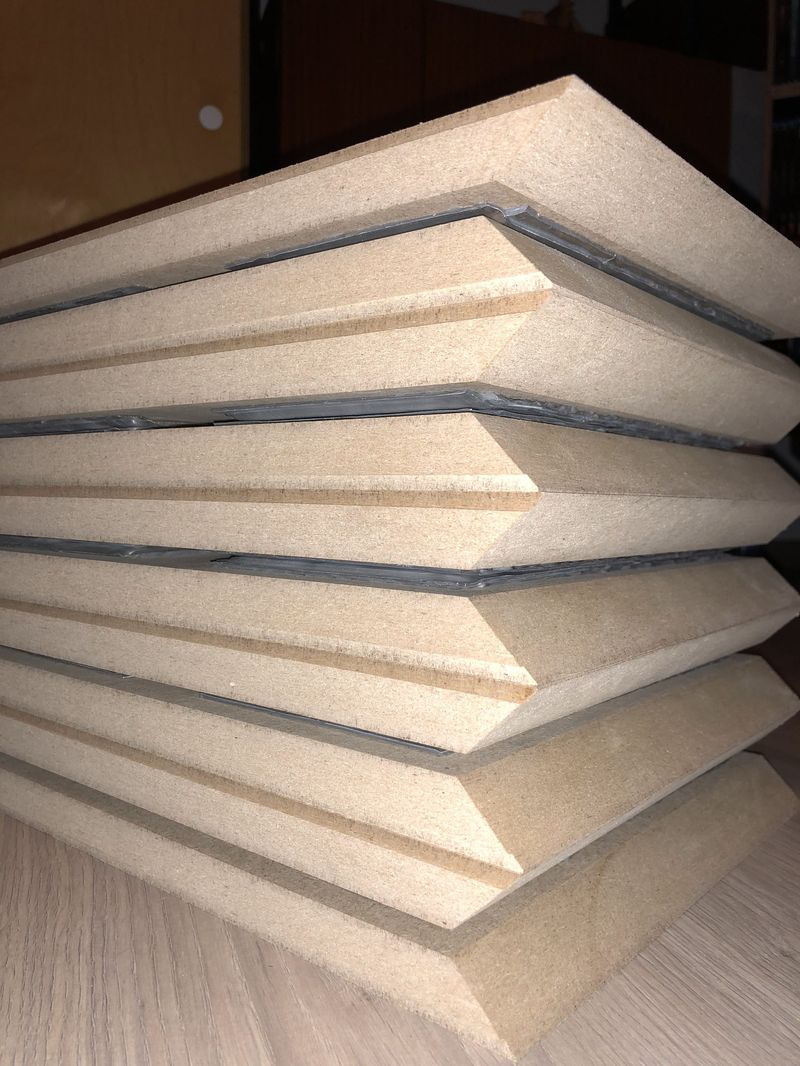 Nach einiger Recherche, wo ich hier im Rhein-Main-Gebiet am besten schwarzes MDF her bekomme, bin ich auf das Bauhaus in Mainz-Mombach gekommen. Der Zuschnitt für die 7 Boxen (immerhin 49 Brettchen) dauerte dann auch keine 20min und der Preis war sehr günstig (35€ schwarz, 13,35€ das normale MDF), echt super.