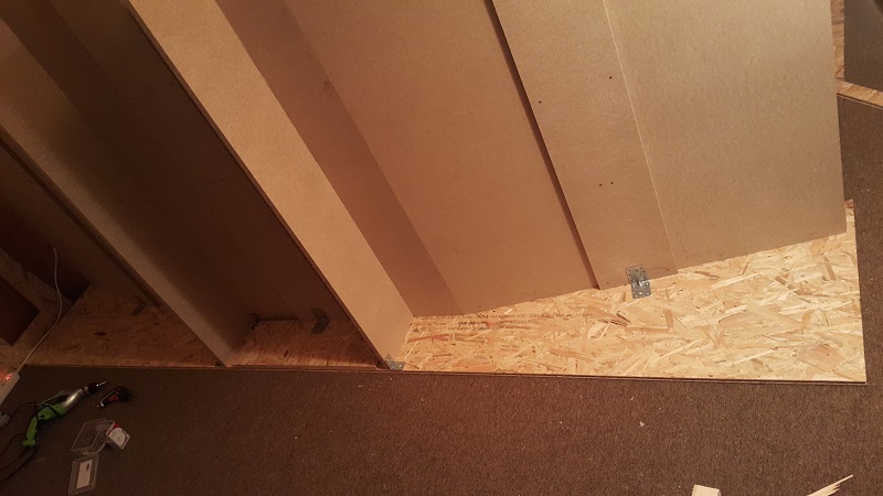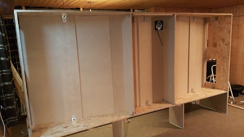 Nach den Weihnachstagen ging es also endlich los mit dem Bau. Doch davor mussten noch mal eben 4 je 215 Liter große Gehäuse für die 4 Stück 18" Luftverschieber gebaut werden, da die hinter der Leinwand verschwinden sollen. Gar nicht so einfach, bei einer geschlossenen, massiven Leinwand, noch 4 dieser Monster dahiner zu verstecken, ohne dafür zusätzliche Raumtiefe zu opfern. Dank CAD und etwas Hirnschmalz kam ich aber zu einer vernünftigen Lösung. In der Mitte liegt der Leinwandkasten direkt an den Subs an und ist dabei genauso tief wie der LaBelle Center. Nach außen hin weicht der Leinwandkasten immer weiter von den Schallwänden der 18"er zurück, so dass diese dann über die Seiten bzw. Raumecken nach vorne strahlen können.