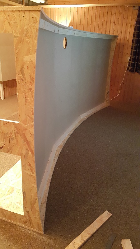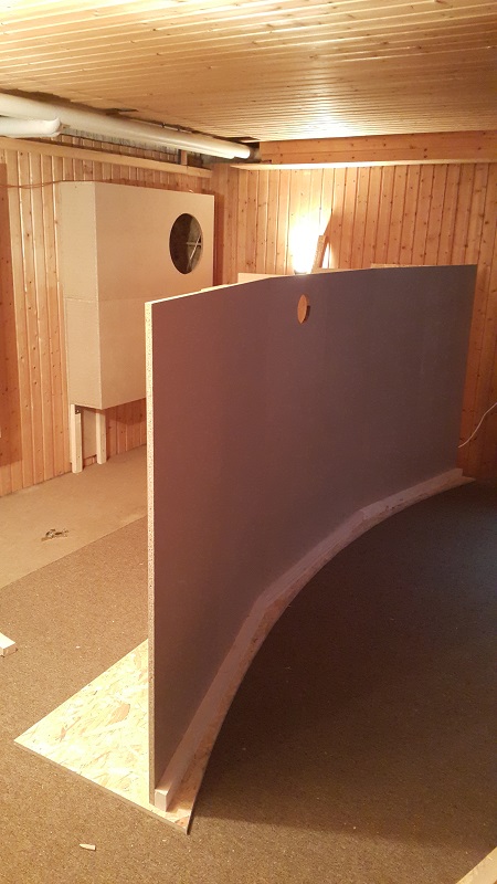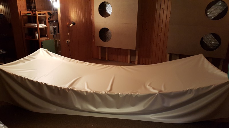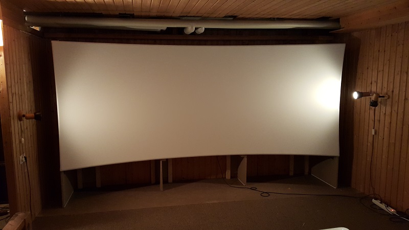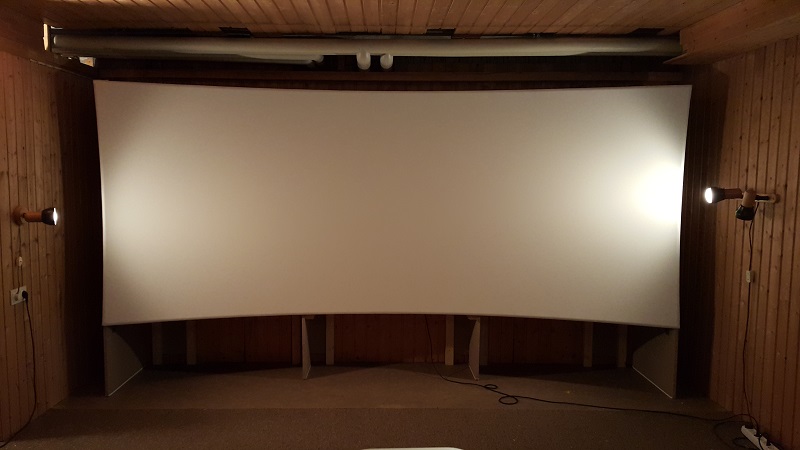 Nun wohnen wir im eigenen Haus mit schönem großem Hobbykeller, so dass nun endlich ein amtliches Kino gebaut werden kann, da der Raum nur für diesen Zweck aus- bzw. umgebaut wird. Beginnen sollte der Ausbau mit dem Herzstück - einer richtigen Leinwand. Richtig heißt für mich curved und natürlich im Cinemascope Format. Und so groß wie irgend möglich... Monatelang habe ich alle Möglichkeiten durchdacht, durchgerechnet, gezeichnet, und bin schließlich zu folgender Lösung gekommen, die für meine Gegebenheiten ideal sein sollte: Die Wand, vor der die Leinwand steht, ist nach Abzug eines kleinen Abstellraums / Technikabteils 4m breit. Nicht wesentlich weniger breit sollte die Leinwand werden. Geplanter Sitzabstand sind 3m. Wenn man jetzt aber die zu erwartende Leuchtdichte ausrechnet, kommt man leider darauf, dass bezahlbare oder gar schon vorhandene Beamer bei 4m grenzwertig dunkel sind, vor allem natürlich bei 3D, was bei mir einen sehr hohen Stellenwert hat. Akustisch transparente Tücher haben i.d.R. noch einen Gainfaktor von knapp unter 1, also erst recht schwierig. Stacking oder Blending Lösungen würden dank Cinemascope, Anamorphot und Curved extrem schwierig und aufwändig, also auch wieder verworfen. Aber es gibt ja auch noch High Gain Folien! Also mal ein Muster der Opera High Gain von Gerriets angefordert, mit Gain 2. Auf einer ebenen Leinwand, besonders bei dem extremen Betrachtungsverhältnis, würde so eine Folie natürlich einen extremen Hotspot verursachen, da unter Winkel der Gainfaktor abfällt, sogar unter 1. Aber ich will ja eh curven, damit ist das beherrschbar. Da es laut meiner Recherche keine vernünftigen akustisch transparenten High Gain Folien gibt, ist damit das Thema AT leider vom Tisch. Geht aber auch anders, und man erspart sich die Probleme mit der Hochtondämpfung, Kammfiltereffekten und evtl. sichtbaren Gewebestrukturen im Bild bis hin zu Moirée Effekten. Das Allerbeste an der Sache: wenn ich schon keine AT Leinwand bauen kann, dann kann ich sie dafür in beide Richtungen krümmen, also eine Torus oder Double Curved! Denn das geht nur mit Vakuum, also per se nicht mit AT. Die Immersion sollte dadurch noch mehr gesteigert, Hot Spot Neigungen weiter reduziert werden. Und außerdem reizte mich der Gedanke extrem, da sowas scheinbar niemand hat und es irgendwie das I-Tüpfelchen und die Königsdisziplin im Leinwandbau ist. Tests auf meiner provisorischen Testleinwand waren sehr vielversprechend, und so wurden endlich 10 qm Opera High Gain geordert.