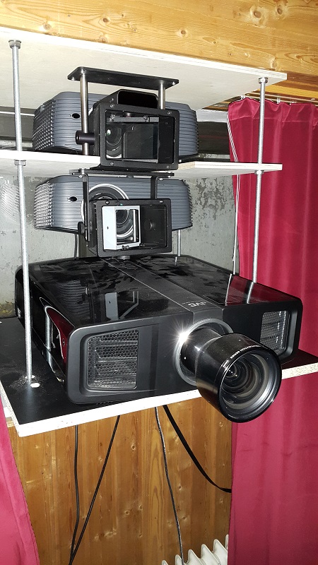 Ein HD36 ist zwar annähernd hell genug, dafür fand ich die Bewegungsunschärfe ohne FI bei dem großen Bild schwer erträglich. Ein HD33 hat zwar eine super FI und damit absolut flüssige Bewegungen, dafür wieder deutlich weniger Licht, das hat mir trotz Gain 2 auch nicht gereicht. Also jetzt eben doch in den sauren Apfel gebissen und das Stack mit 2 HD36 gebaut: Noch mehr Licht, und ein schönes, ruhiges, natürliches Bild, da keine Shutter mehr.