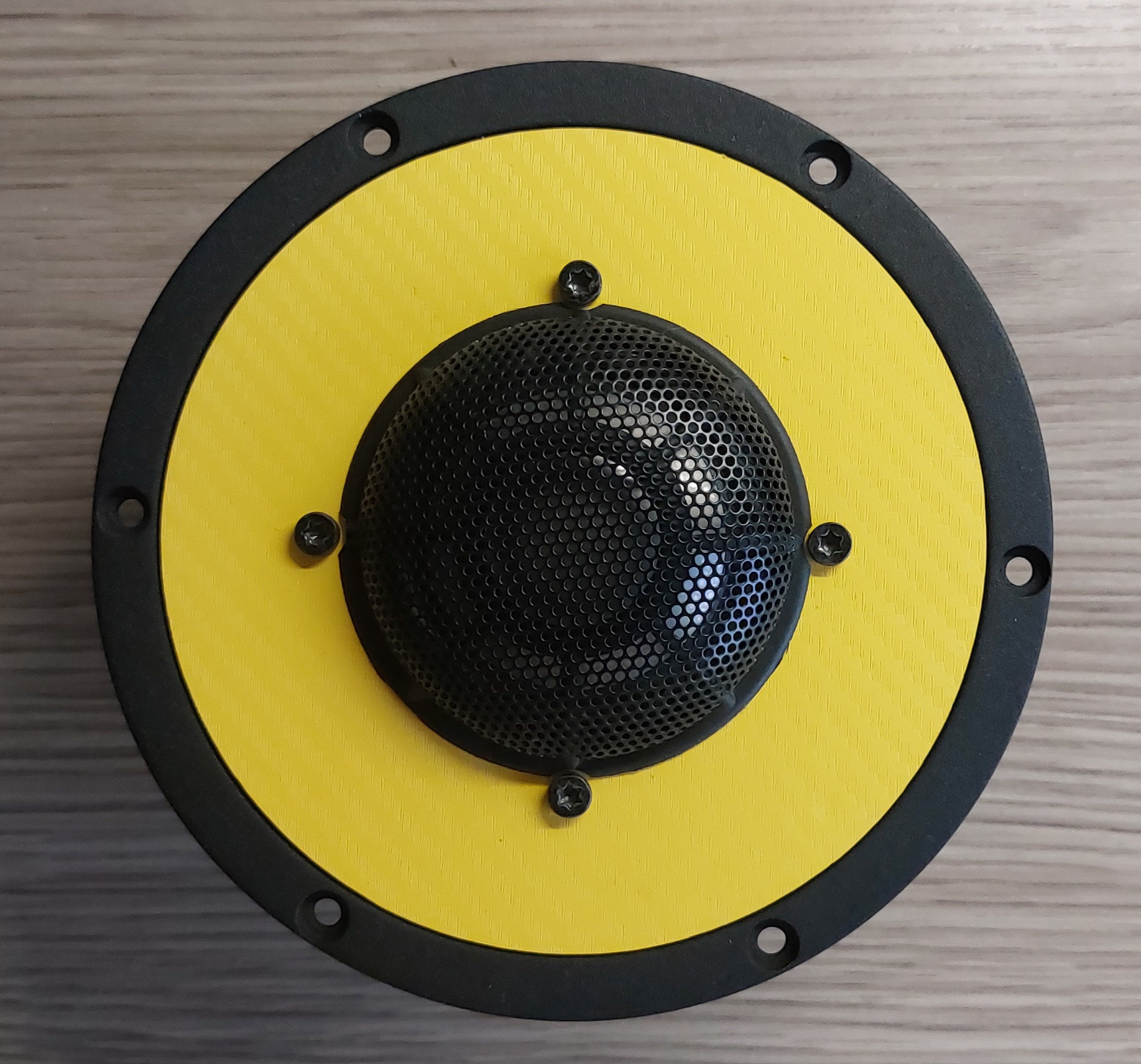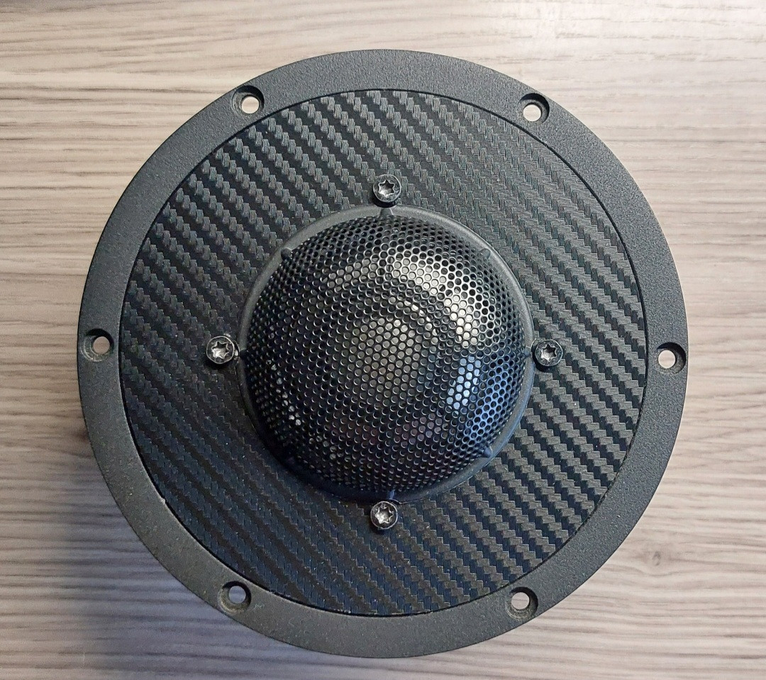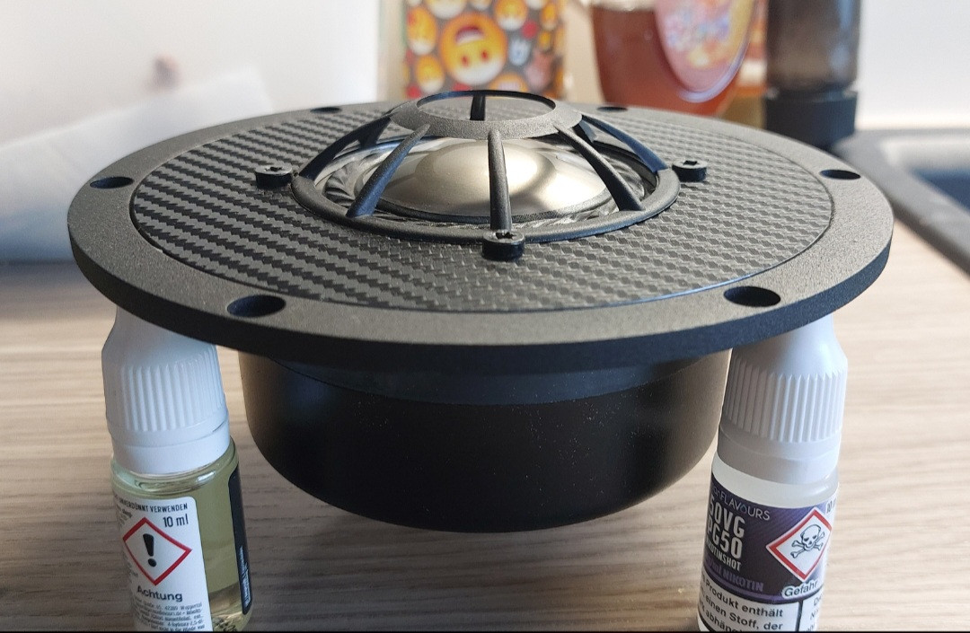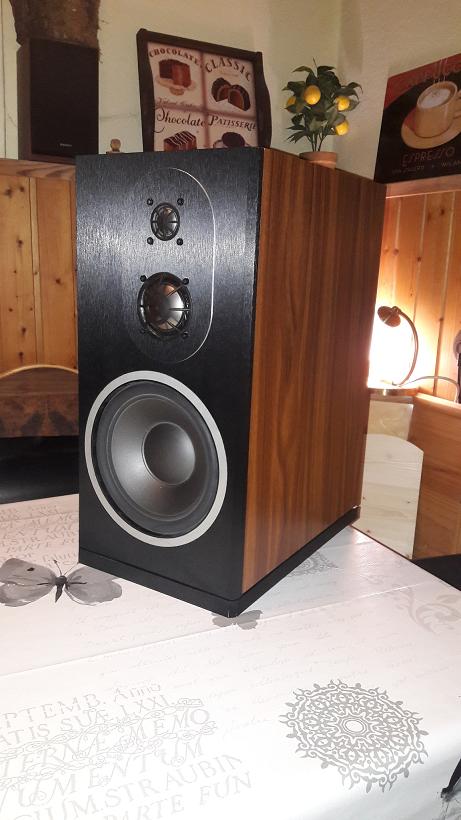 das verkleinern ging noch weiter, jetzt mit dem WSP21S, der kann auch genug. Schon seltsam was aus einem Projekt so werden kann. Ist derweil nur locker verschraubt die Front mit dem Tieftöneraluring, hängt deswegen leicht schief. Die Aluplatte für die beiden DSM's ist 2,5mm dick und wird mit der Front verkebt, so kann man später die Kalotten tauschen im Fall der Fälle. Einfräsen wollte ich die Kalottenplatte nicht, deswegen habe ich sie erst aus einer MDF Schablone ausgefräst, dann die Kanten per Schleifpapier auf gebürstete Kante gebracht, als Designpunkt. Alles an der Box ist Folie, das Gehäuse Nussbaum, die Front und Bodenplatte Alu Schwarz gebürstet Folie aus dem Net. Sieht Hammer aus diese Folie. Muss noch alles fein nachgearbeitet und gereinigt werden. Dann Weiche rein und hören. Hatte noch mehr Bilder, die sind irgendwie verschwunden.