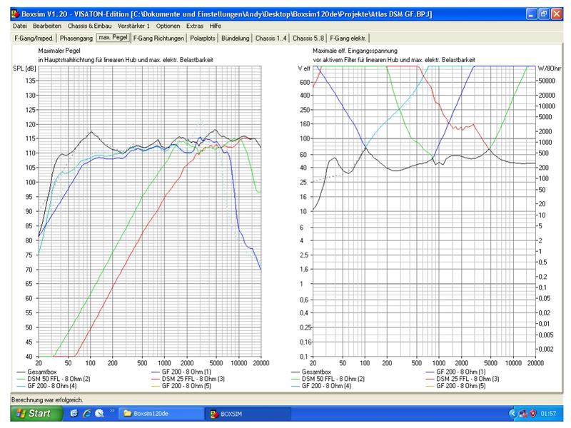 Habe mir jetzt den Kopf zerbrochen, habe GF250 und GF200 eingehend in Boxsim verglichen, unten die Bilder, einmal GF250 geschlossen vs GF200 Bassreflex und einmal beide Chassis in Bassreflex, jeweils in 35 Liter netto. Ergebnis, der GF250 bringt keine Maxpegelvorteile in 35 Liter als der GF200. In 35 Liter BR kann der 200er lauter als der 250er CB. Gut, war zu erwarten. Aber beide Chassis in BR nehmen sich nichts, der Maxpegel im relevanten Bereich bleibt so gut wie gleich. Nur unter 30hz könnte der 250er mehr, was aber nicht notwendig ist. Dementsprechend gab es eine Neuplanung, nun doch 3,5 Wege, 2 * GF200 mit der runden Front für die 2 Kalotten. Was soll eine um einiges größere Box wenn sie nicht mehr kann als eine deutlich kleinere ausser wuchtig auszusehen. Bin nun bei 105cm höhe, 40cm tiefe und 25cm breite, entspricht ca. 78 Liter netto. Auch vom Grundwirkungsgrad ändert sich nichts, bleibt bei ca. 90dB. Auch das äussere entspricht meinen optischen Vorstellungen, jeder hat ja so seine wenigen optischen Favoriten.
