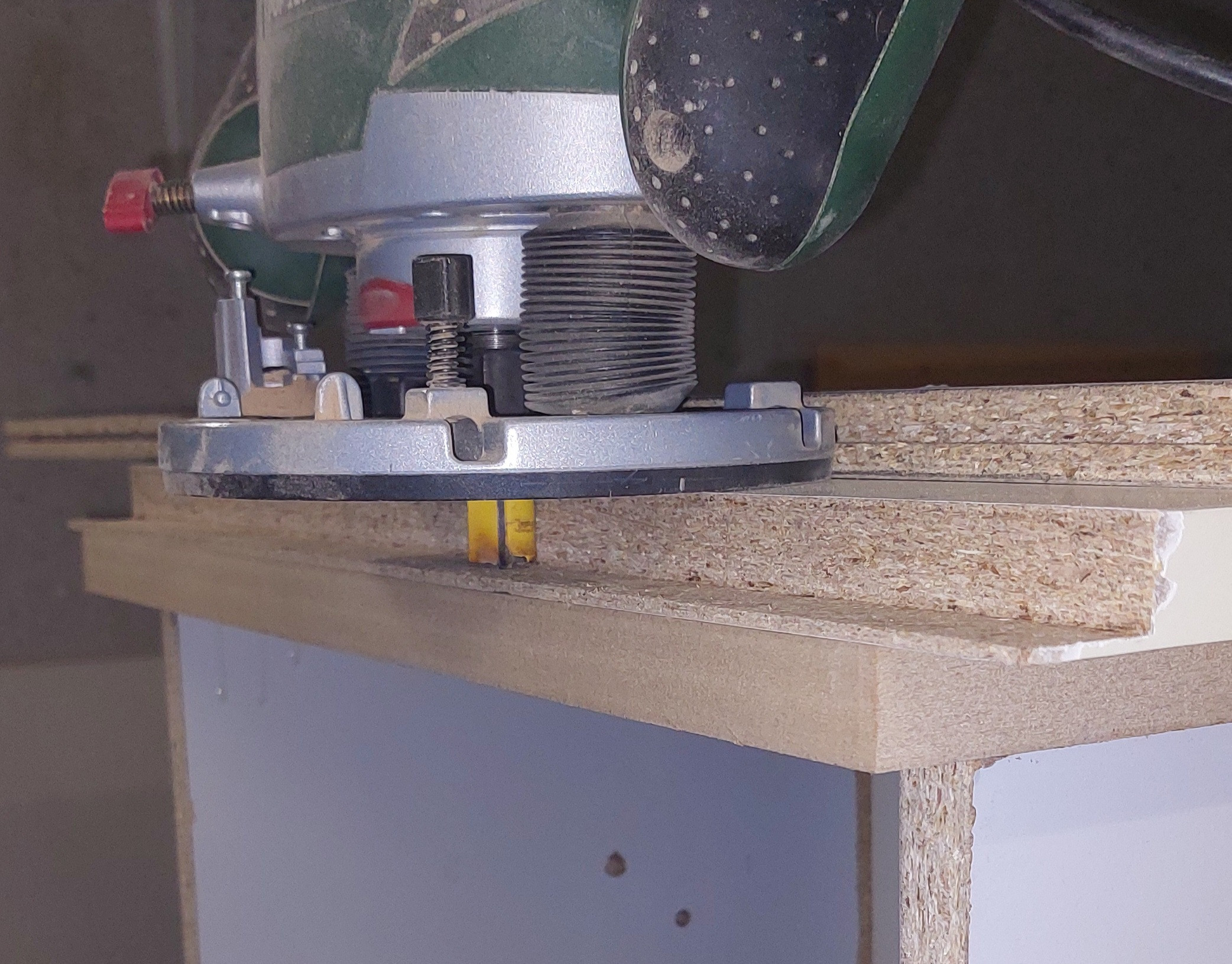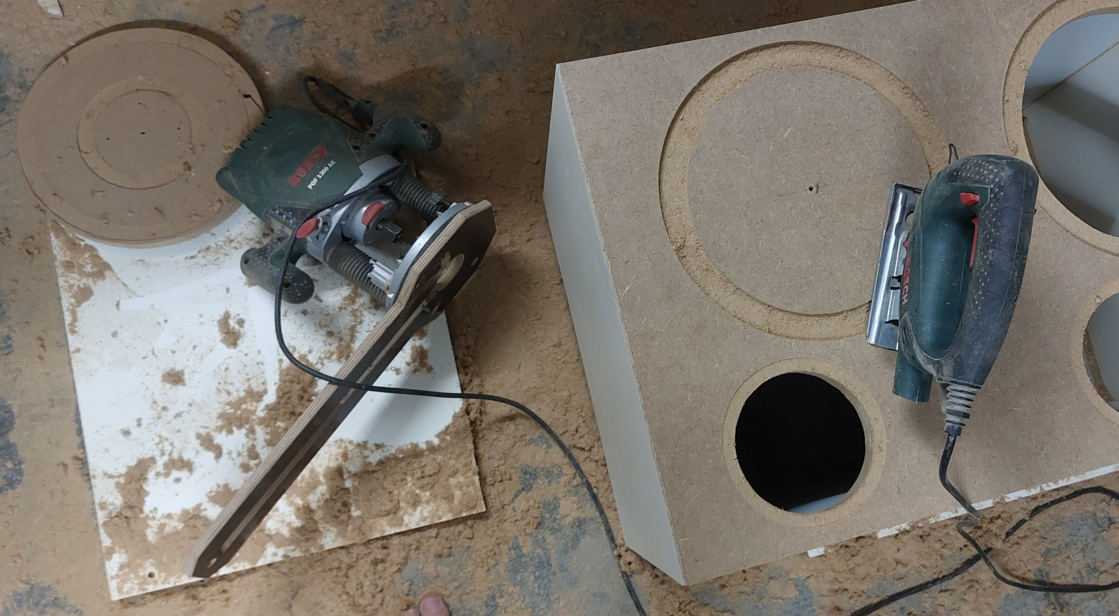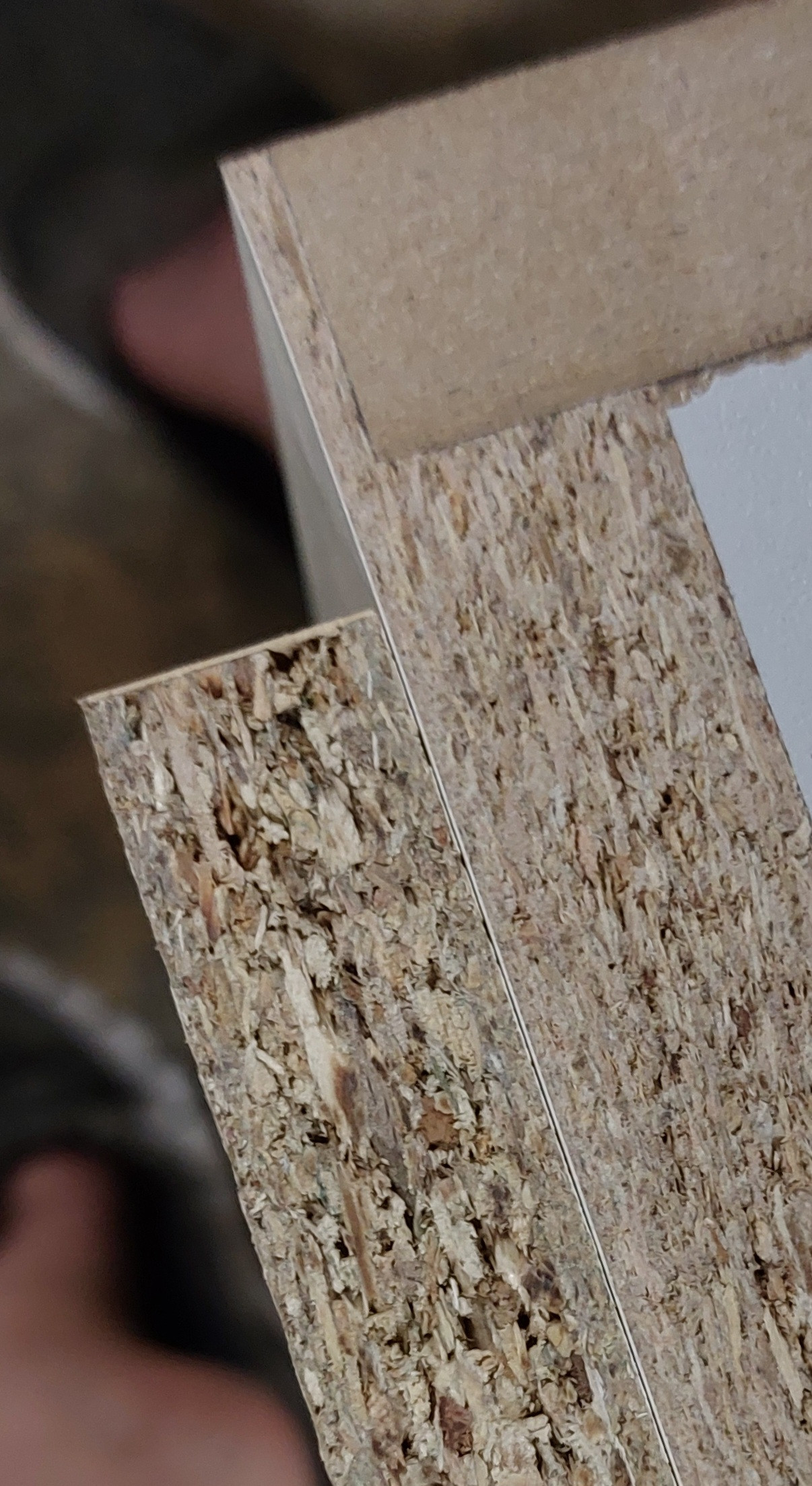 Heute alles Bündiggefräst, die Chassis und Bassreflexrohre eingefräst und das Anschlussfeld nur eingesägt. Die Rückwand sieht eh kein Mensch und ist aufgrund der Verschraubungen eh hässlich. Der Kantendurchdrückschutz hat wunderbar geklappt, im gleichen Bild auch die alte Spanplatte von früher und die vor kurzem gekaufte. Man sieht deutlich wie grob die verarbeiteten Späne sind im Gegensatz zur alten Platte die sicher gut 50 Jahre alt ist. Rechts die alte, links die neue wo die Fräse sich durchquälen muss, die alte Platte fräst sich ohne Probleme und ohne rattern der Fräse.