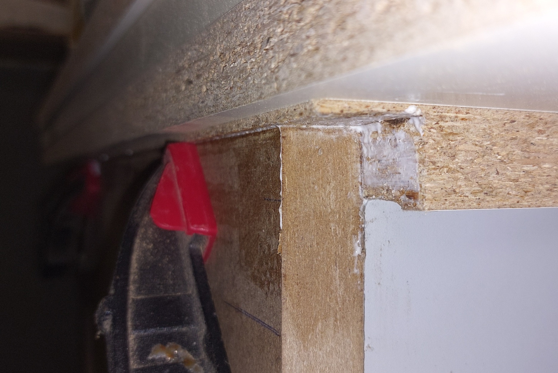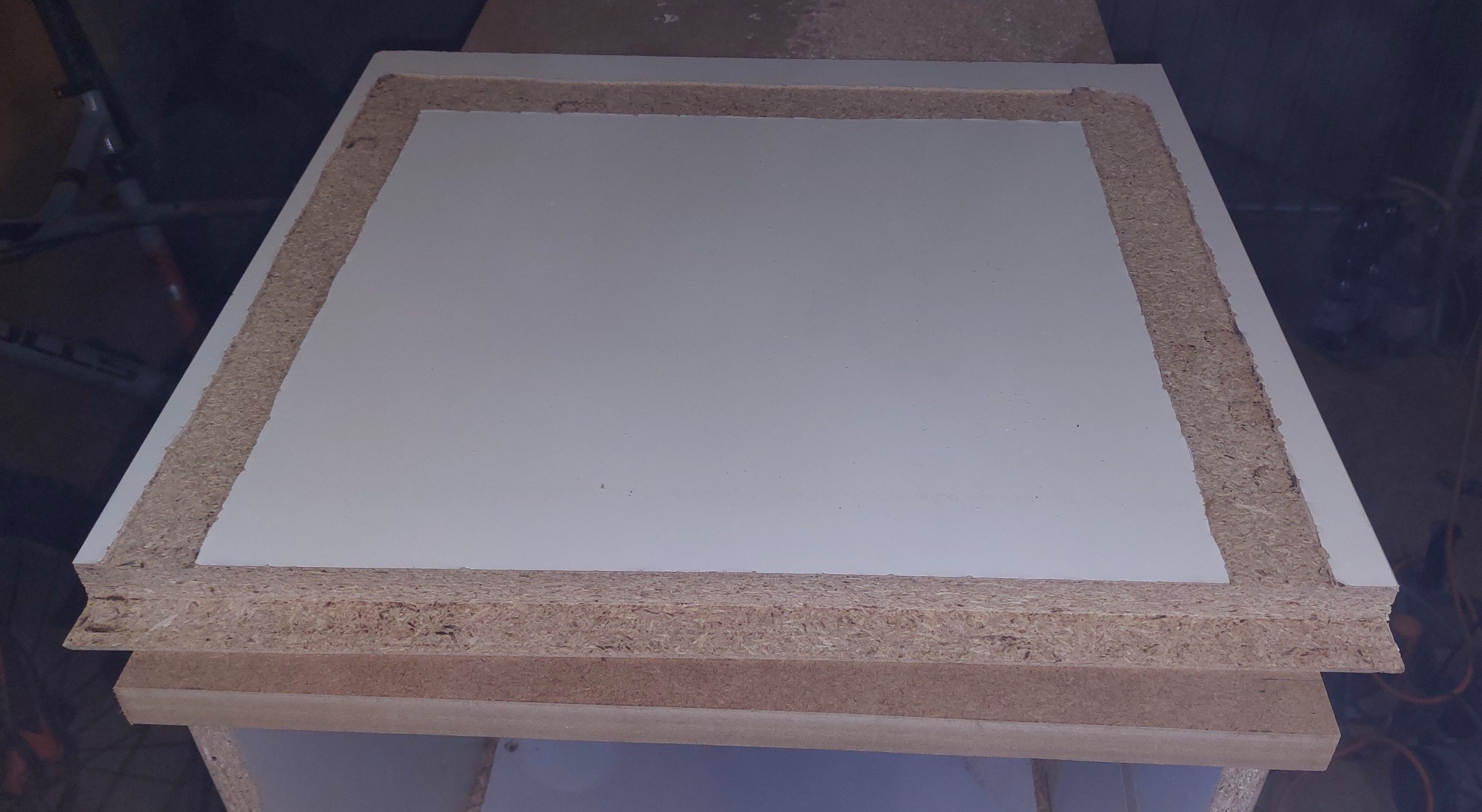 Hier ein Foto der Verklebung der beiden kleinen Spanplatten zu einer großen. Ist schwer die Fuge überhaupt zu erkennen, ist wie ein Brett zu Werten.