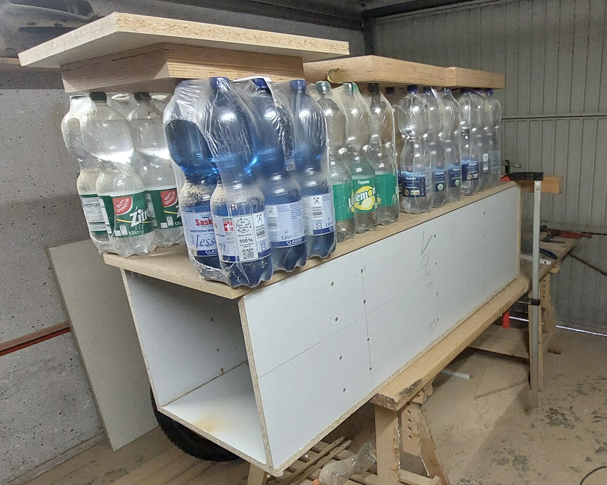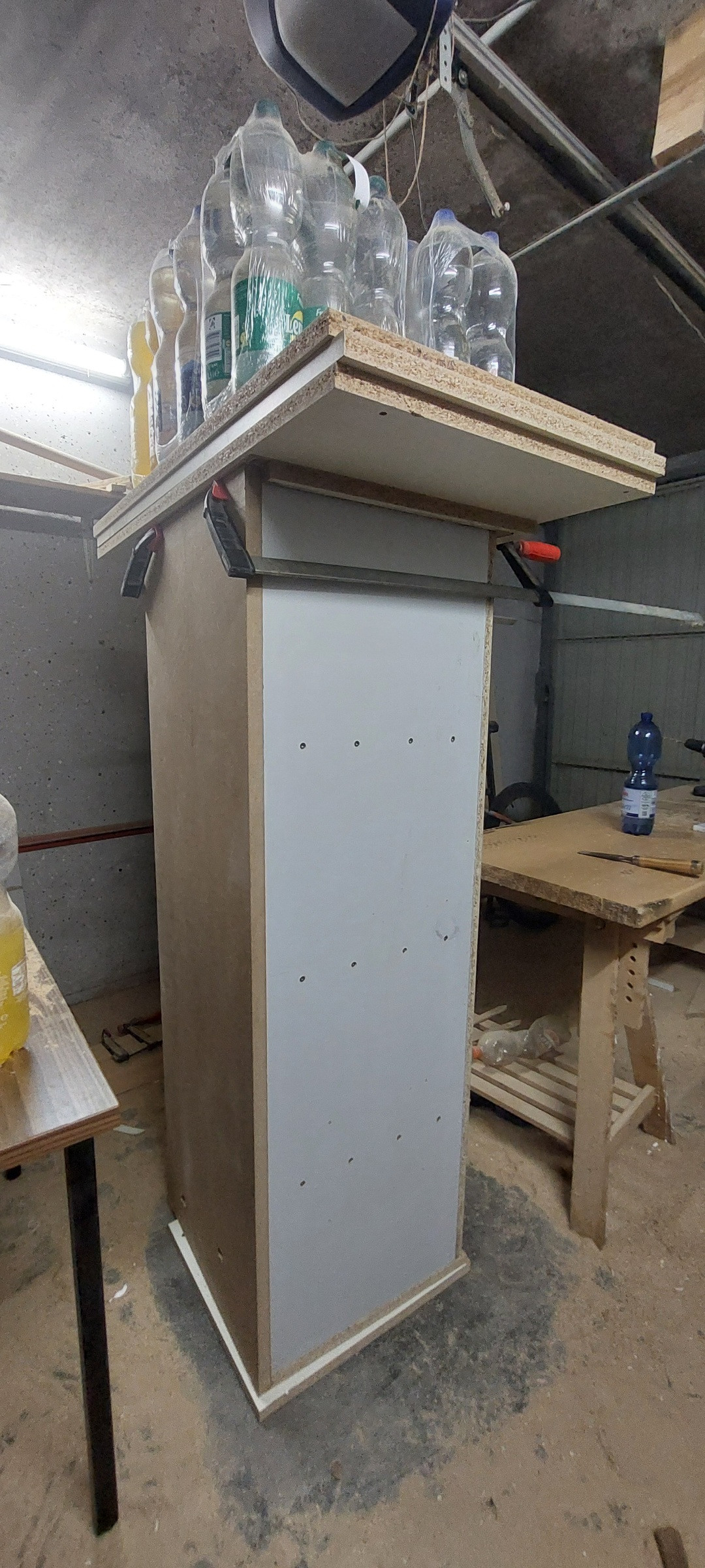 Heute war die Frontplatte dran, an den Stellen die später ausgefräst werden für Chassis und BR-Rohre wurden Löcher gemacht in denen die Zwingen halt finden um einspannen eines Kantholzes welches die Platte Richtung Überstand drückt und gleichzeitig den Überstand mit der Seitenwand auf Flucht hält damit dieser sich nicht wegbiegt. 2 weitere Zwingen drücken die Schallwand nach unten, so ist diese Stelle komplett verpresst. Den Rest erledigen wieder die Trinkflaschen.